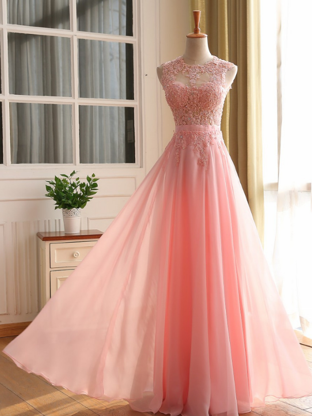 Lace Chiffon Pink Bridesmaid Dresses with Lace Appliques