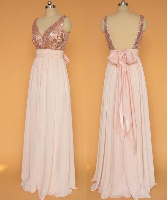 Chiffon and Sequins Backless Bridesmaid Dress with Bow, Bridesmaid Dresses, Long Bridesmaid Dresses, Party Dresses