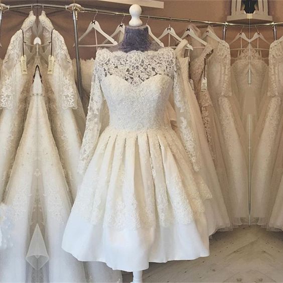 Bateau Neckline Long Sleeve A-line Wedding Dresses, Short Bridal Gowns