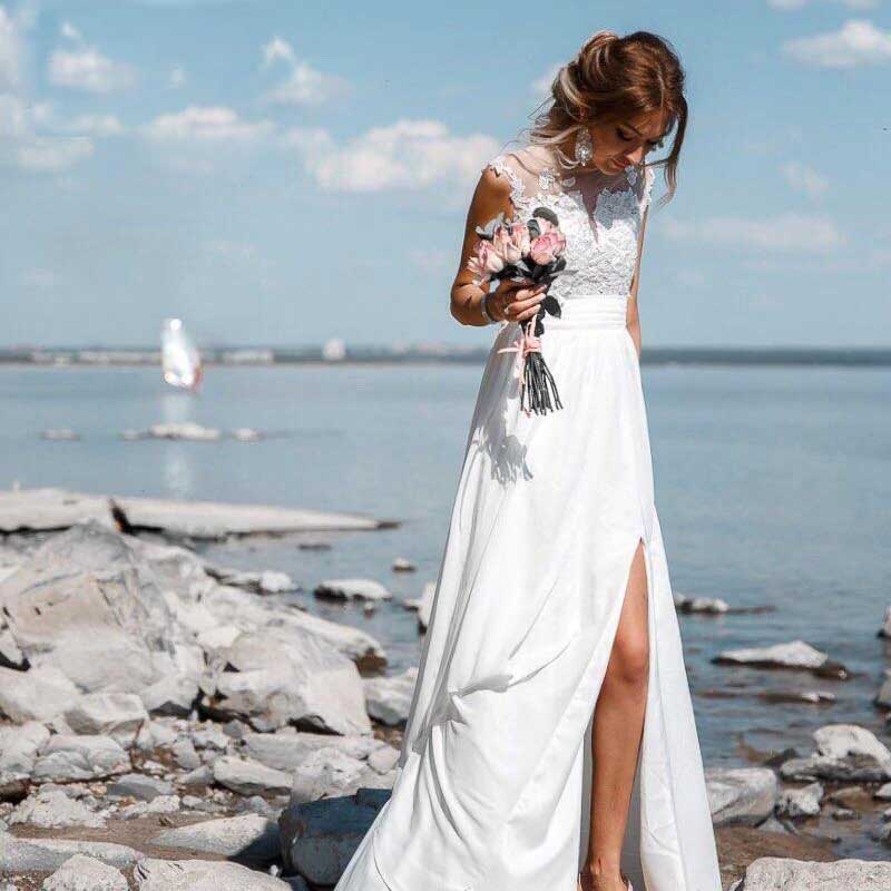 White Chiffon Beach Wedding Dresses with Lace Appliques