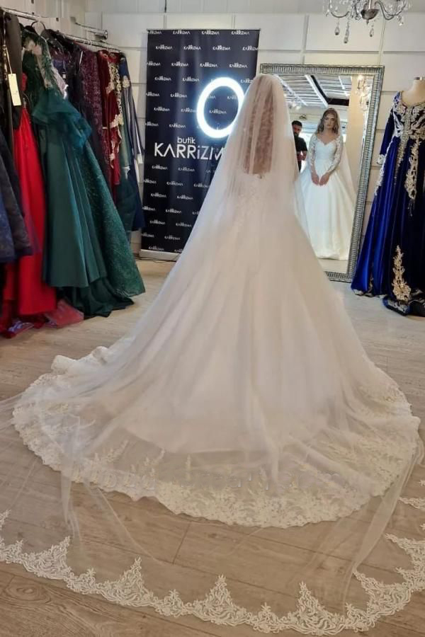 White A-line V-neck Lace Wedding Dress with Long Sleeves