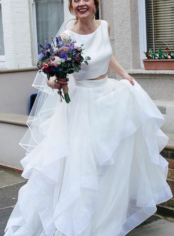 2 Pieces Satin and Tulle Wedding Dresses, Long Bridal Dresses