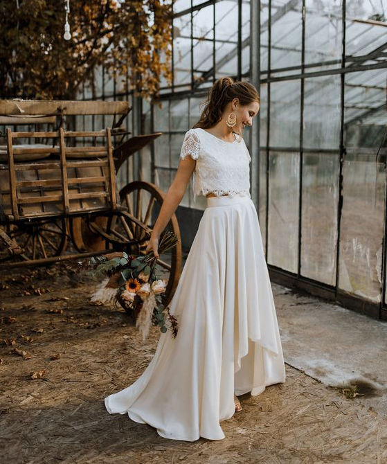 2 Pieces Lace and Satin Wedding Dresses, 2 in 1 Wedding Gown, hi-lo Bride Dress