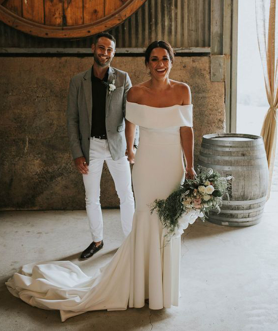 Off-the-shoulder White Mermaid Wedding Dresses with Long Train