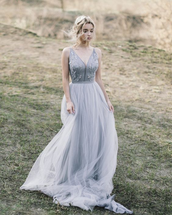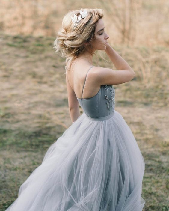 Blue Gray Boho Wedding Dresses, A-line Colored Wedding Gown