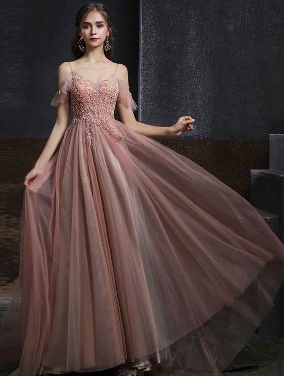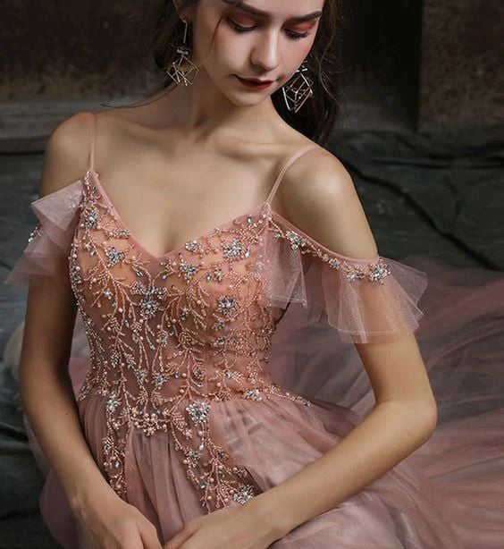 Spaghetti Pink Beaded Prom Dresses, Sexy Party Dresses, Engagement Party Dresses